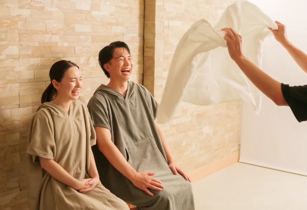水着やポンチョ、サウナ着を着用して男女でサウナを楽しむことが出来ます!