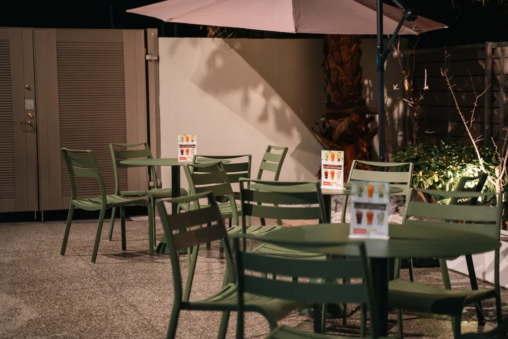 お着替えの手間なしでサウナの前後に屋外で飲食を楽しむことができます。