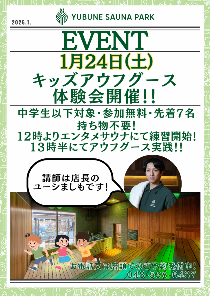 キッズアウフグース体験会開催のお知らせ 2026年1月10日 中学生以下のお客様を対象にアウフグース体験会を開催いたします。 店頭又はお電話にてご予約を承ります。 詳しくは画像をご覧ください。 一覧へ戻る