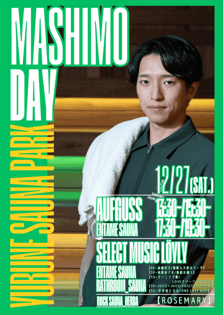 12月スタッフDAYのお知らせ 2025年12月3日 YUBUNE SAUNA PARKでは毎月スタッフDAYを開催! 12月は4名のイベントを開催! 当日はミュージックロウリュのセットリストとロックサウナのハーブをセッティング! 1日4本のアウフグースでお客様をおもてなしいたします! イベントスケジュール 12/6:家入将DAY 12/14:日光ふとしDAY 12/20:あやぱるDAY 12/27:ユーシましもDAY 皆様のご来館心よりお待ちしております!! 一覧へ戻る