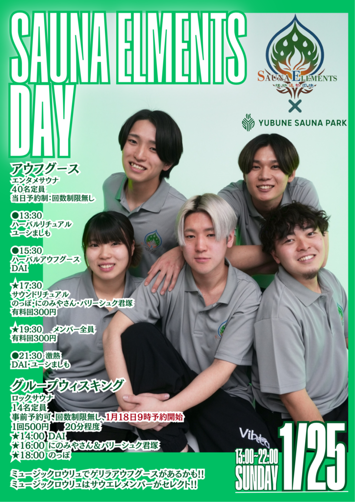 植物を使用したチームによるイベントを開催!! 2026年1月9日 YUBUNE SAUNA PARKにて 1月25日にて植物温熱団体サウナエレメンツが屋外エリアをジャック!! 一日通して、植物の香りをお届けいたします!! グループウィスキングのご予約は18日より予約開始! 一覧へ戻る