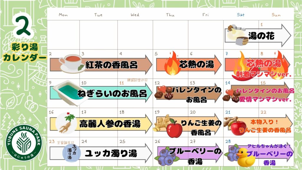 2月度イベント風呂カレンダー! 2026年1月18日 2月の彩り湯カレンダーを公開! 彩り湯が毎日綺麗な色に染まっていきます!! 週末はパワーアップバージョンでお客様にワクワクするおふろをお届け!! ご来館お待ちしております! 一覧へ戻る