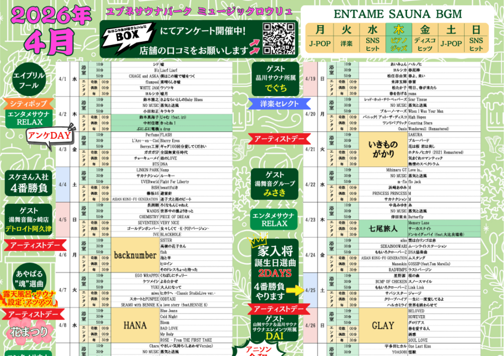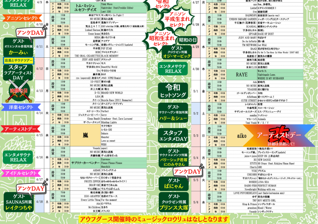 4月&GWもミュージックロウリュ、YUBUNE SAUNA PARKをお楽しみくださいませ。