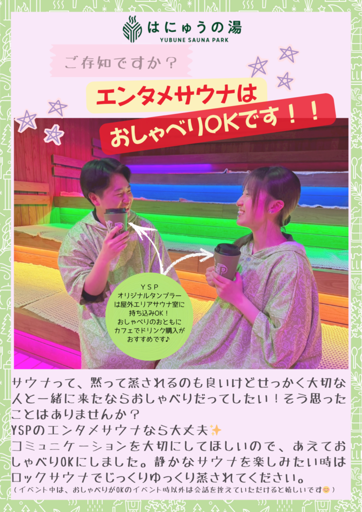 YUBUNE SAUNA PARKではお客様同士でのコミュニケーションを大切にしていただきたいと思っております。そこで、屋外エリアにあるエンタメサウナは、サウナの本場フィンランドのように、会話OKの社交場のようなサウナとしてご利用いただけるようにおしゃべりをOKとしております!ぜひ大切な人との会話や周りの人とのコミュニケーションを楽しんでください(※エンタメサウナにてイベント実施時は、会話OKのイベント実施時以外はおしゃべりはおひかえください。)