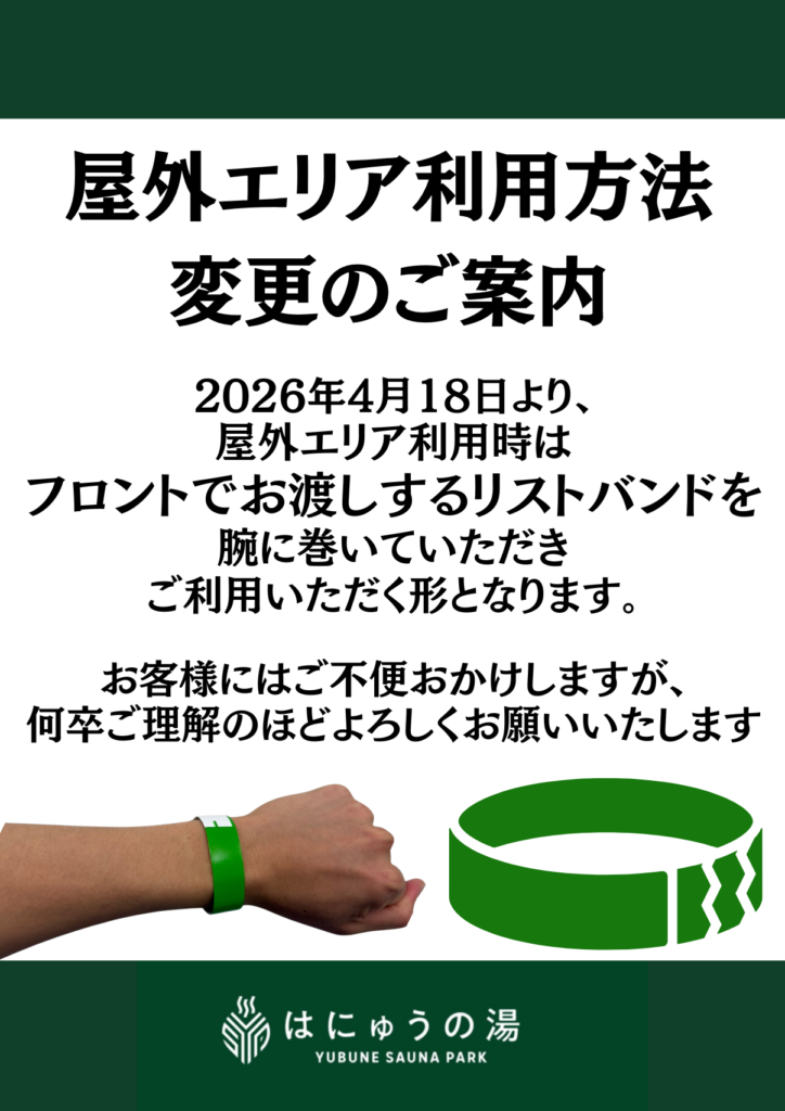 4月18日(土)から、料金改定に伴い屋外エリアの利用方法が変更となります。屋外エリアご利用の際にはフロントでお渡しするリストバンドを腕に巻いてご利用いただくことになりますので、入館受付後にフロントにお立ち寄りください。