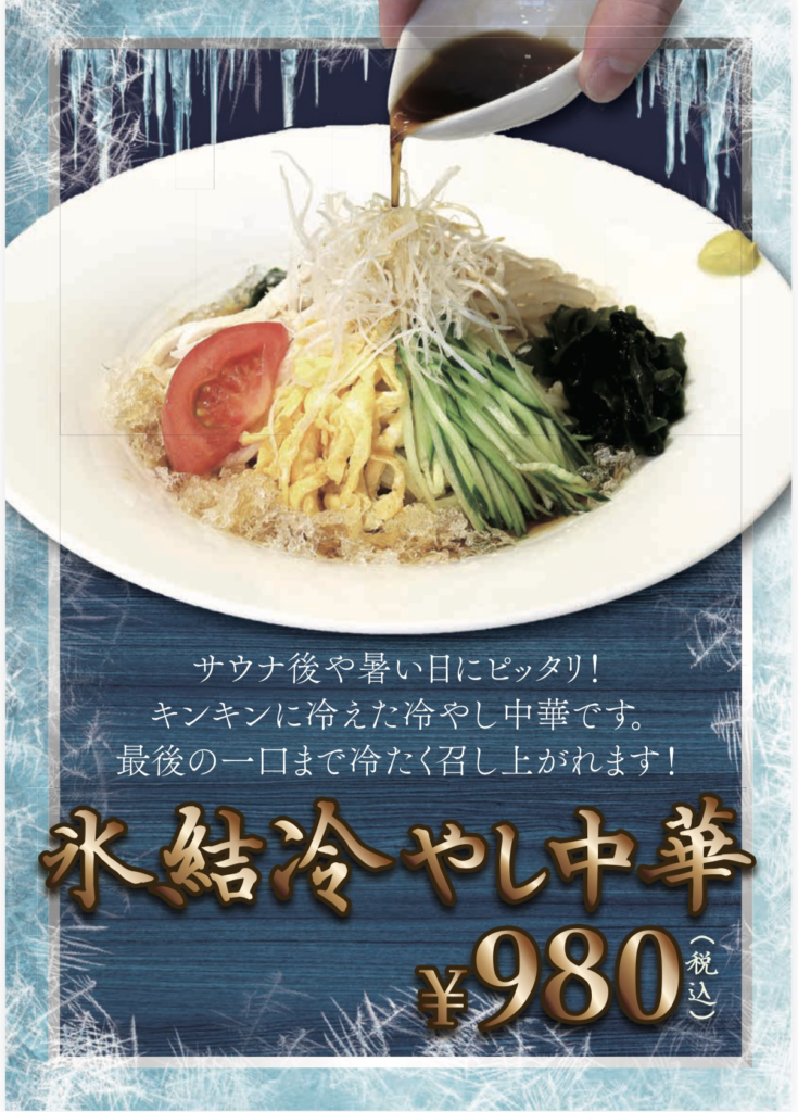 まずは屋内のレストランでオーダーできる【氷結冷やし中華】こちらは暑い季節にぴったりなメニューです!火照った身体も喜ぶ、キンキンの冷たさでご提供させていただきます。