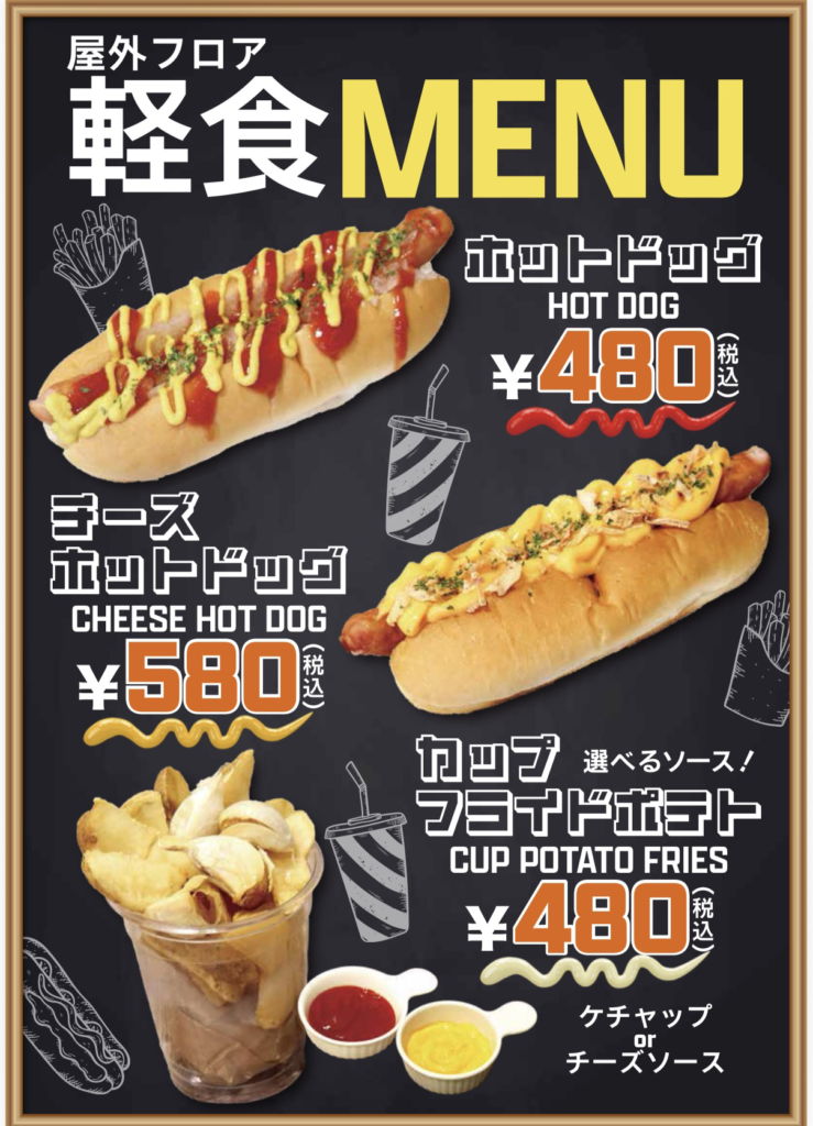 続いて屋外にあるカフェエリアから注文できる【軽食メニュー】!ホットドッグやチーズホットドッグでアウフグース間の小腹を満たしたり、カフェエリアでおしゃべりを楽しみながらカップフライドポテトをつまんだり…。ちょっと何か食べたいけど着替えてレストランに行くのは面倒…という方にもピッタリです♪