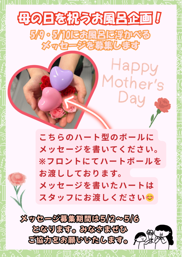 みなさまに書いていただいたメッセージは、5/9(土)・5/10(日)に開催する彩り湯イベント《母の日ありがとうのお風呂》でお風呂に浮かべさせていただきます。