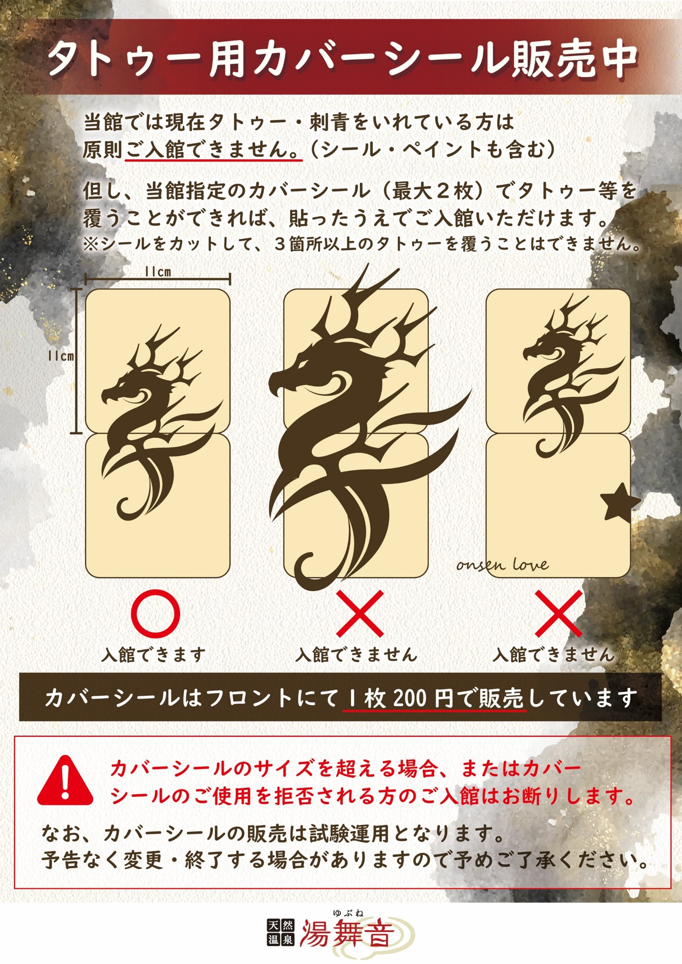 但し、当館指定のカバーシール(最大2枚)でタトゥー等を覆うことができれば、貼ったうえでご入館いただけます。